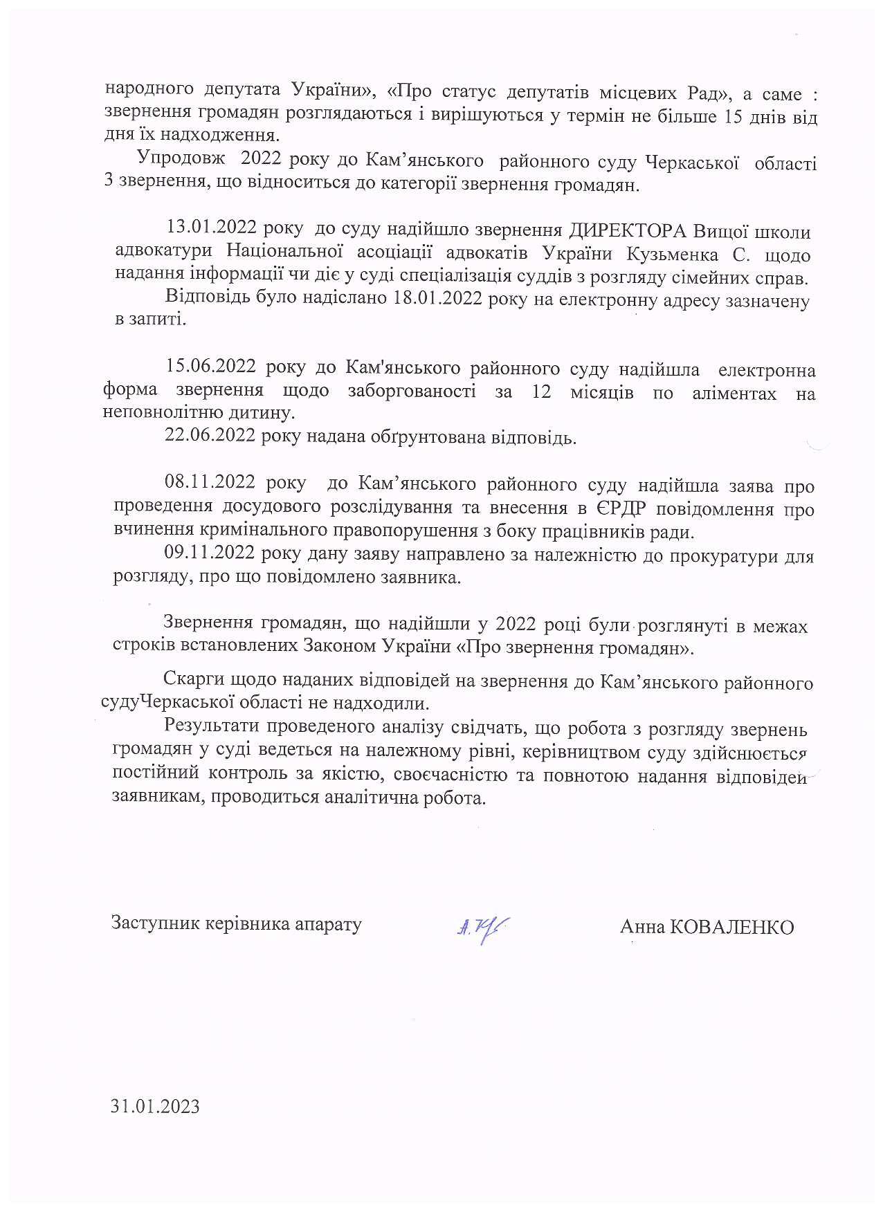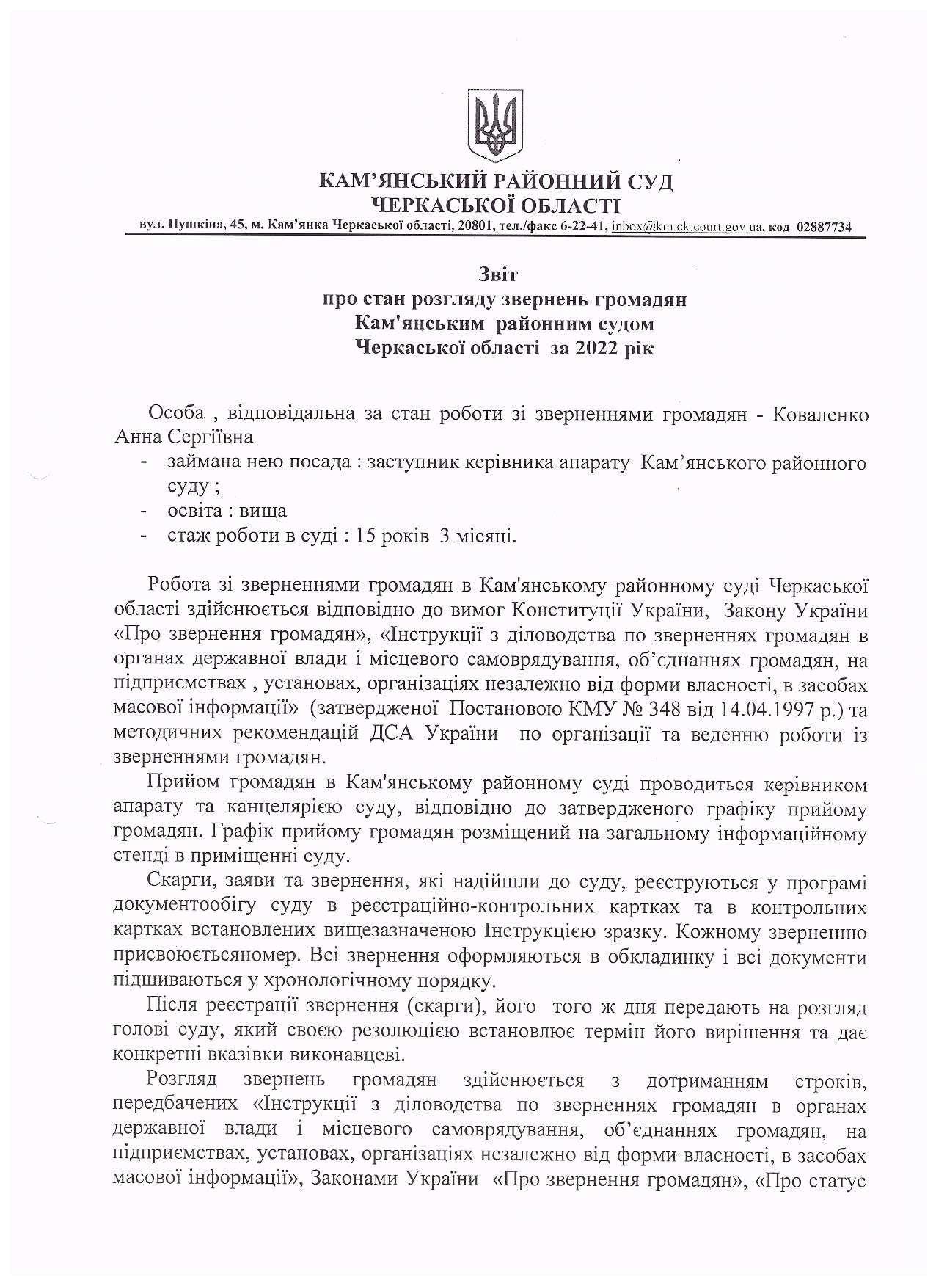 Інформація про кількість та стан розгляду Кам'янським районним судом Черкаської області звернень громадян у продовж 2022 року